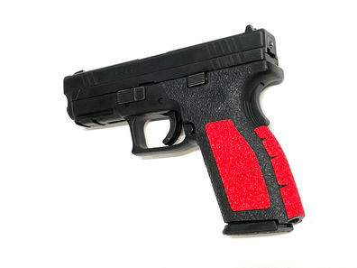 COMBINATION TEXTURED RUBBER AND SANDPAPER GRIP MATERIALS COME TOGETHER FOR THE PERFECT COMBINATION! INSTALL THE MAIN GRIP FIRST AND THEN APPLY THE SANDPAPER PANELS AND BACK STRAP. PLEASE MAKE SURE TO CLEAN YOUR FIREARM WELL WITH ALCOHOL PRIOR TO THE INSTALATION OF THE GRIP. TO ENSURE THE GRIP ADHERES TO THE FIREARM, REMEMBER TO HEAT THE GRIP UP WITH A HAIR DRYER AND SQUEEZE THE GRIP DOWN, CLEAN, INSTALL, HEAT.