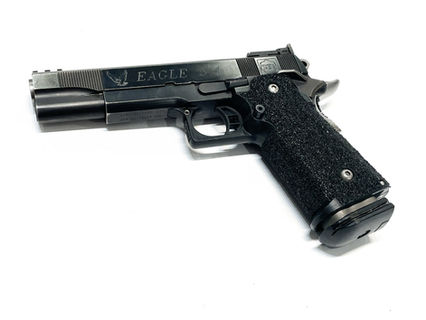 SANDPAPER: OUR SANDPAPER MATERIAL IS EXACTLY THAT "SANDPAPER" AND HAS A VERY AGGRESSIVE GRIP TEXTURE. PERFECT FOR COMPETITION OR RANGE SHOOTING, NOT RECOMMENDED FOR CONCEAL CARRY. AVAILABLE IN BLACK AND GRAY. A WIDE VARIETY OF SANDPAPER MATERIAL COLORS ARE AVAILABLE WITH OUR CUSTOM GRIP ORDERS.